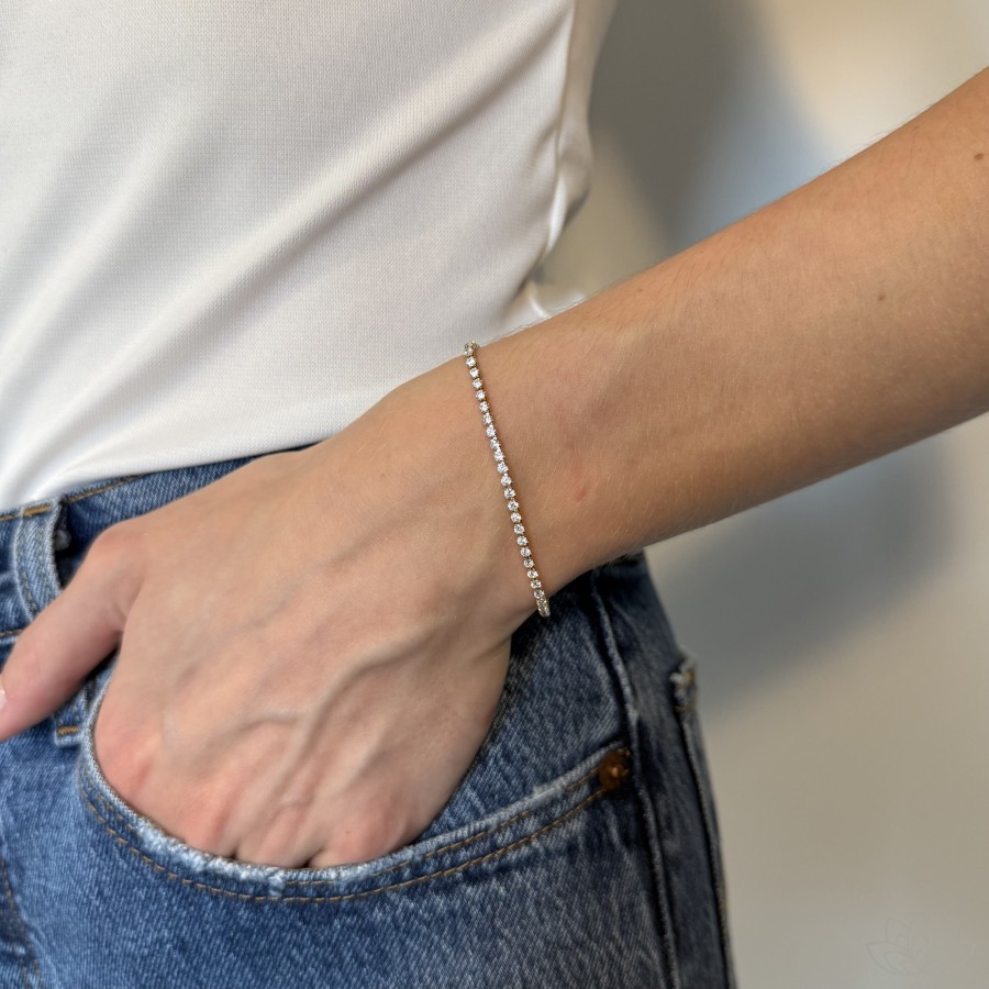 Elegancka bransoletka typu tenisowego, wykonana ze stali szlachetnej w kolorze złota. Zdobiona rzędem połyskujących cyrkonii, które pięknie odbijają światło i dodają blasku każdej stylizacji.