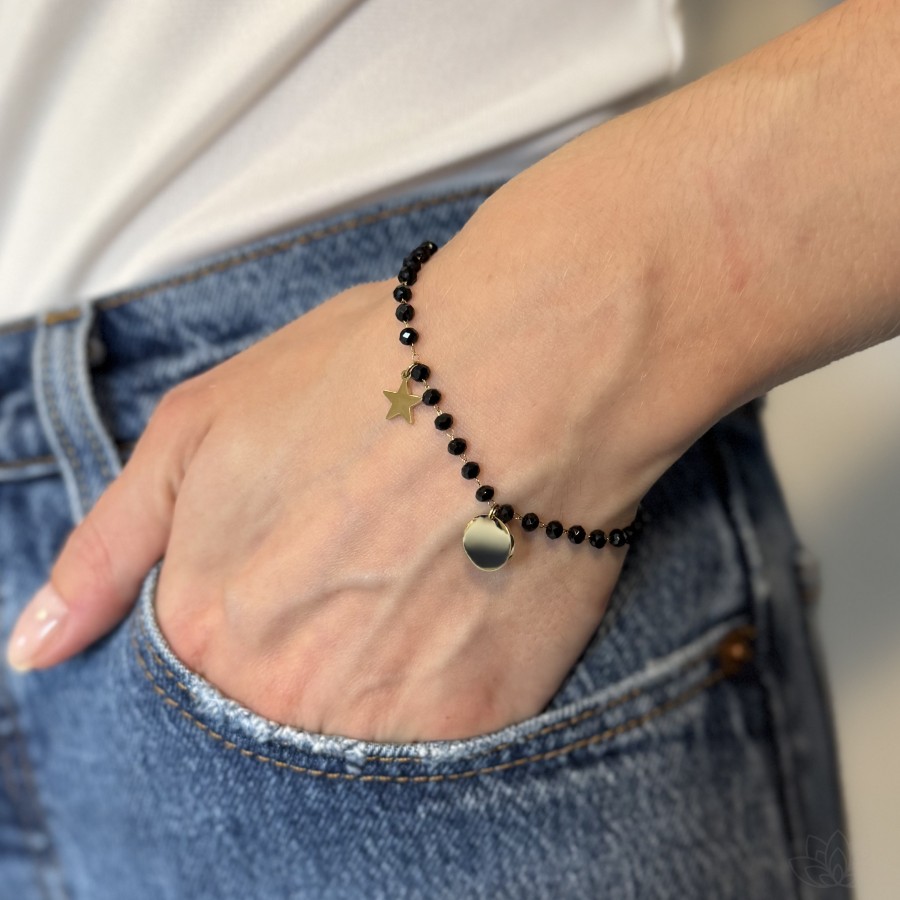 Bransoletka z czarnymi koralikami i zawieszkami – medalik i gwiazdka