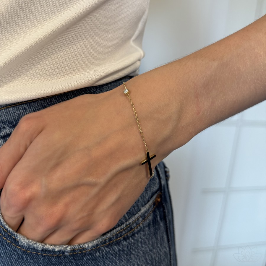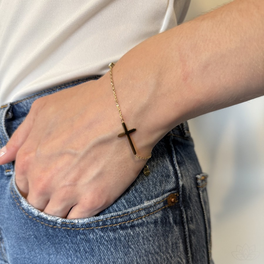 Delikatna, elegancka bransoletka w kolorze złota, wykonana ze stali szlachetnej. Ozdobiona minimalistycznym motywem krzyża oraz drobnymi elementami dekoracyjnymi, które nadają jej wyjątkowego charakteru.