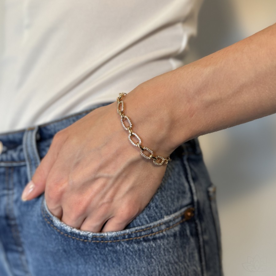 Wyrazista bransoletka wykonana ze stali szlachetnej w kolorze złota. Jej charakterystyczny, większy splot nadaje całości nowoczesnego i eleganckiego wyglądu, idealnie komponując się zarówno z codziennymi stylizacjami, jak i bardziej wieczorowymi zestawami.