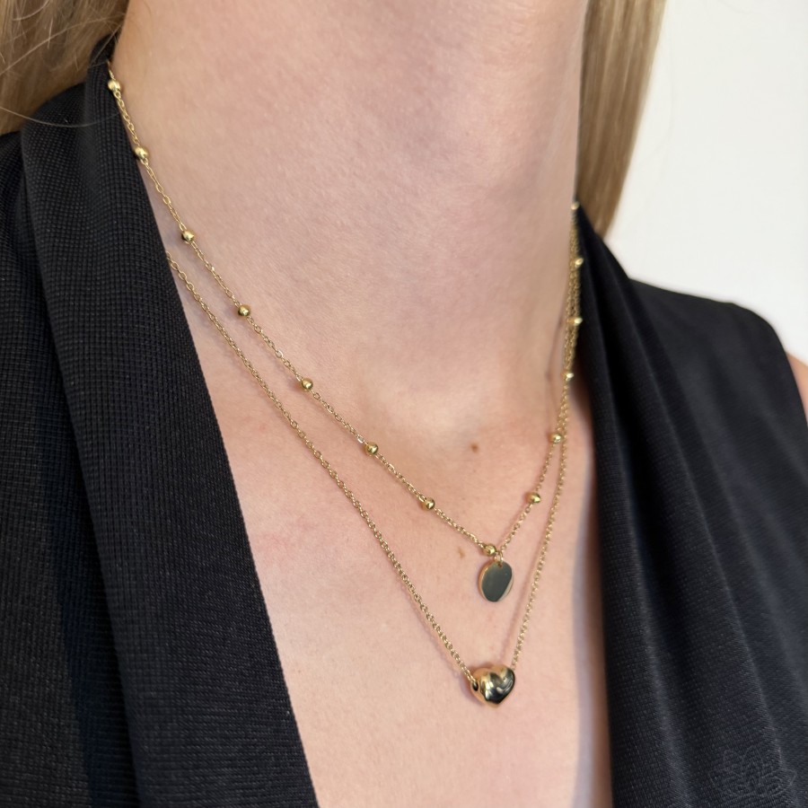 Dolny łańcuszek zakończony jest zawieszką w kształcie serca, a górny – subtelną okrągłą blaszką. To połączenie klasyki i nowoczesności, które pięknie podkreśli dekolt i doda elegancji każdej stylizacji.