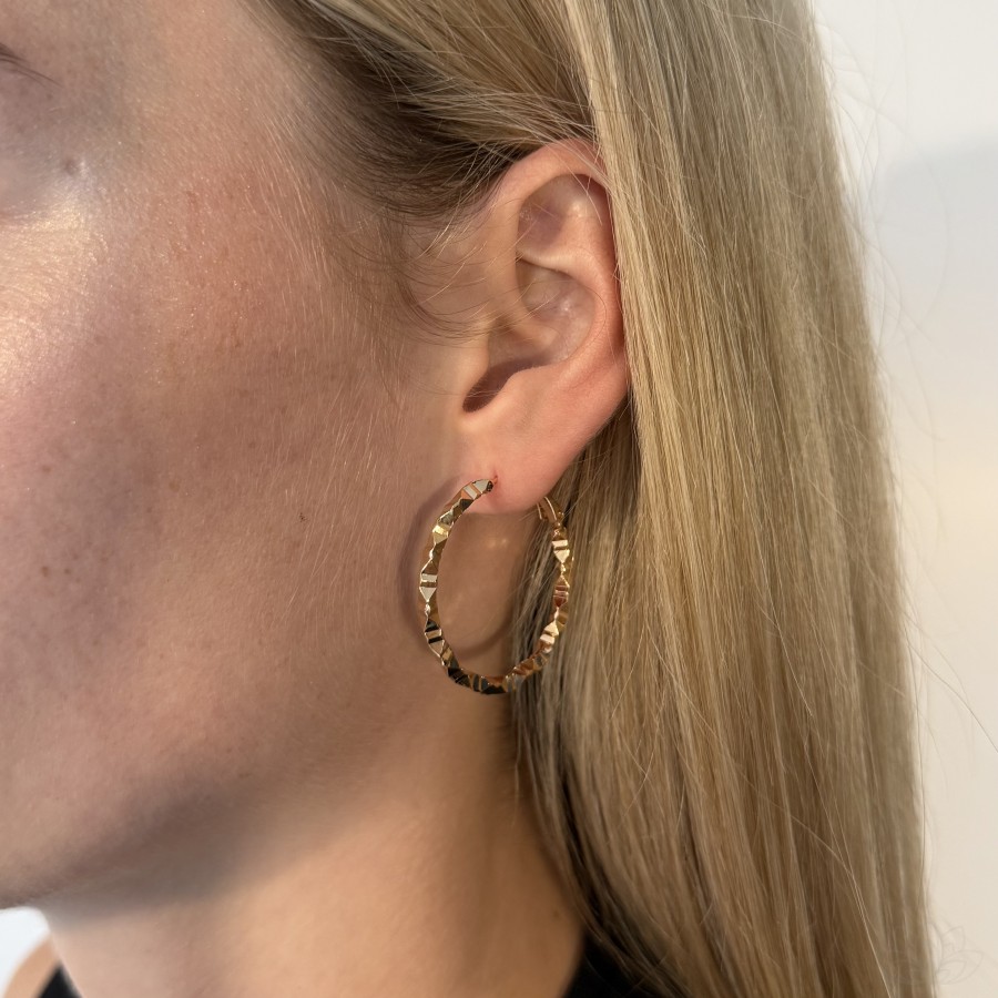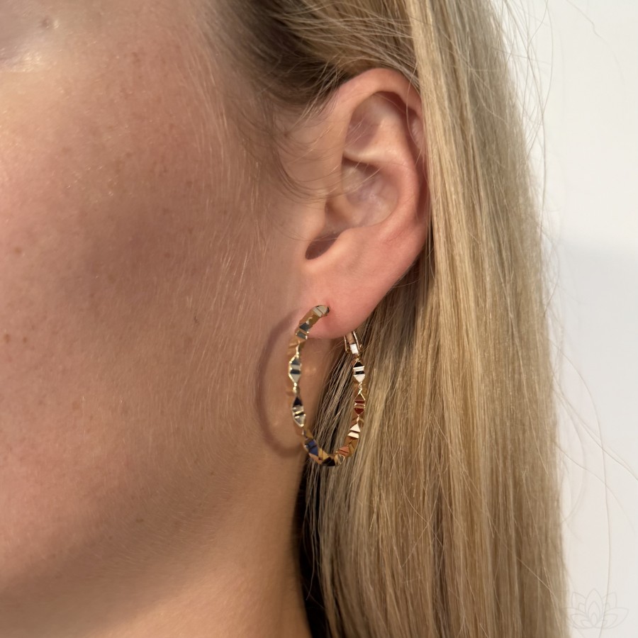 Kolczyki koła o średnicy 3,5 cm, wykonane w złoconym wykończeniu z młotkowaną fakturą. Subtelne załamania powierzchni sprawiają, że biżuteria pięknie odbija światło, tworząc wyjątkowy efekt. To połączenie klasyki i nowoczesności – idealne do noszenia na co dzień i na specjalne okazje.