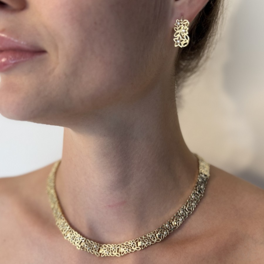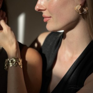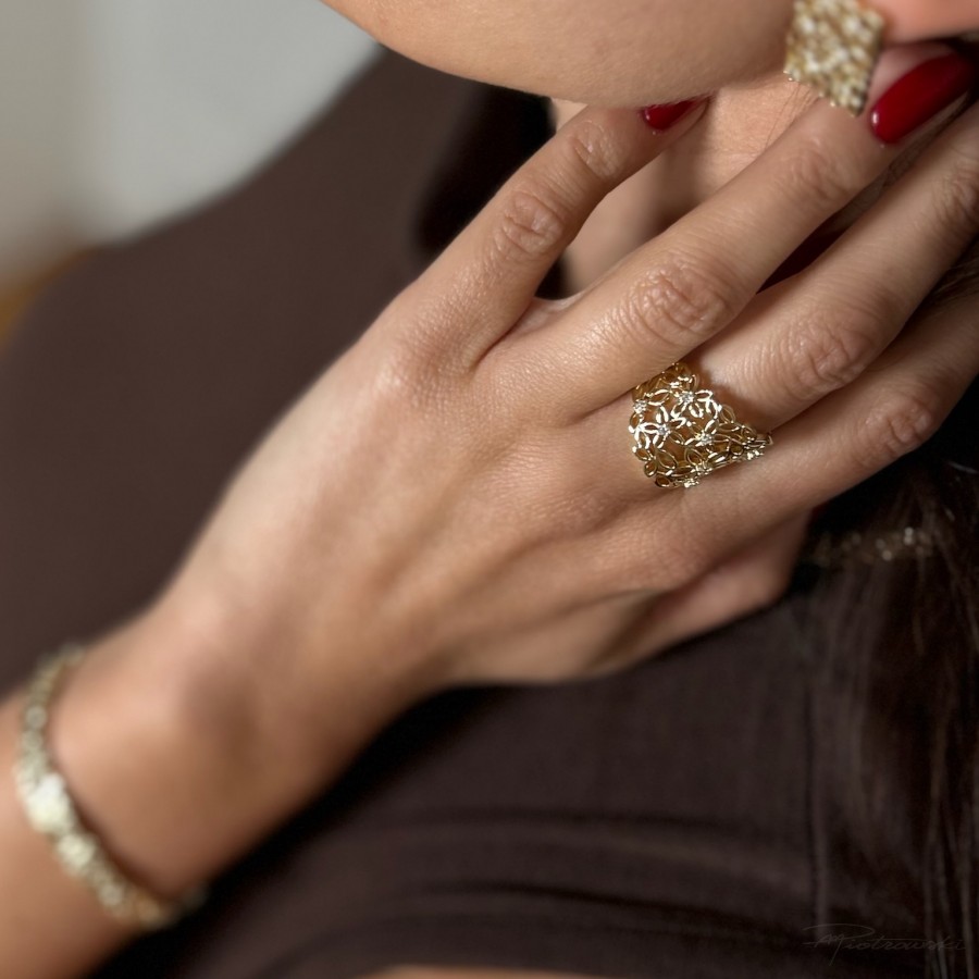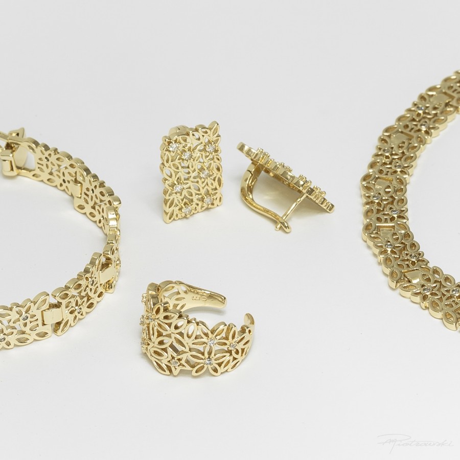 Wyjątkowy komplet biżuterii wykonany z miedzi, metalu od wieków cenionego za swój ciepły odcień oraz właściwości wspierające energię i siły witalne. Każdy element ozdobiony jest ażurowym, kwiatowym motywem wysadzanym błyszczącymi cyrkoniami, które dodają całości elegancji i subtelnego blasku.