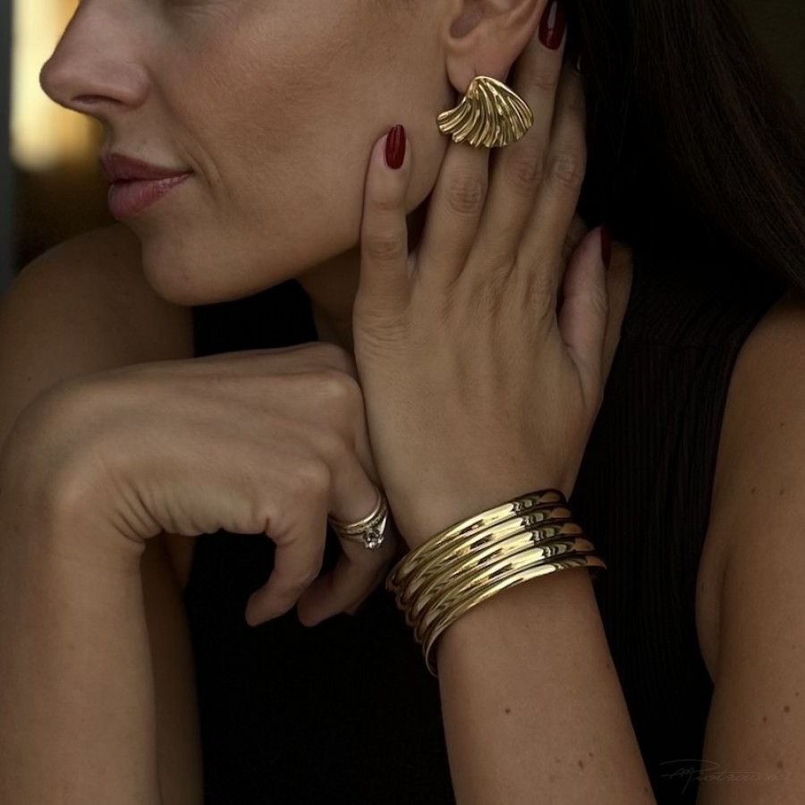 Kolczyki w formie złoconego liścia miłorzębu symbolizują siłę, długowieczność i harmonię. Ich subtelna forma sprawia, że pasują zarówno do codziennych, jak i wieczorowych stylizacji. Bransoletka z wieloma rzędami metalu tworzy mocny, nowoczesny akcent, który pięknie podkreśla charakter każdej stylizacji.